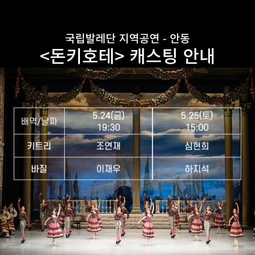 국립발레단 지역공연 <돈키호테> 캐스팅 안내 2024-04-19 국립발레단 지역공연 안동 <돈키호테>의 캐스팅을 안내드립니다. --------------- 2024. 5. 24(금) ~ 5. 25(토) 금 19:30 / 토 15:00 안동문화예술의전당