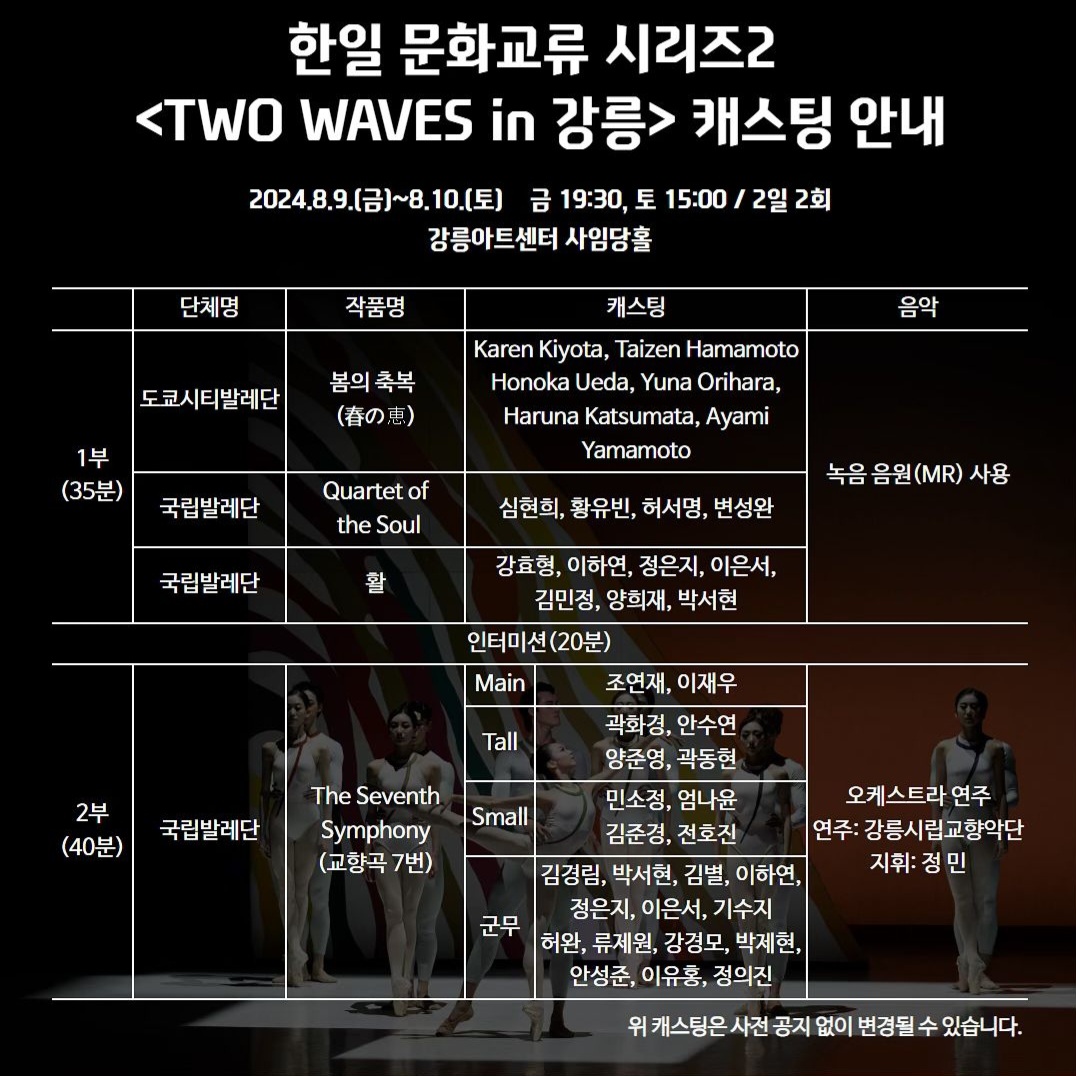 한일 문화교류 시리즈2 캐스팅 안내 2024-07-11 한일 문화교류 시리즈2 <TWO WAVES in 강릉> 의 캐스팅을 안내드립니다. 관객 여러분의 많은 성원 부탁드립니다.