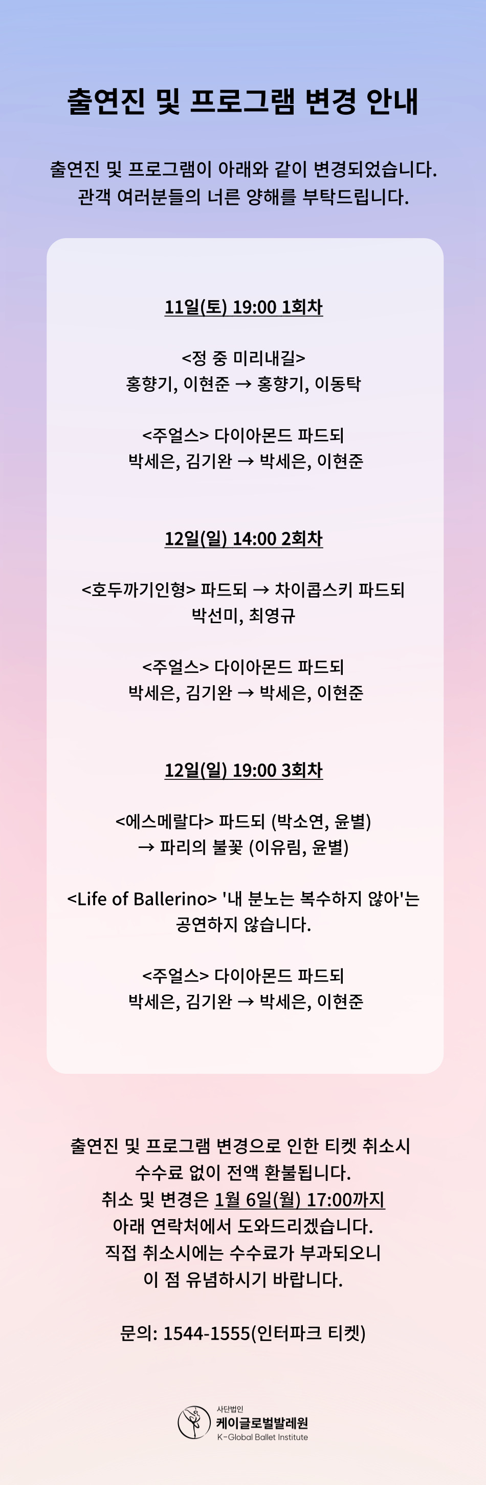 - (사)케이글로벌발레원 정기 후원자(1인 4매) : 20% (기획사 문의)