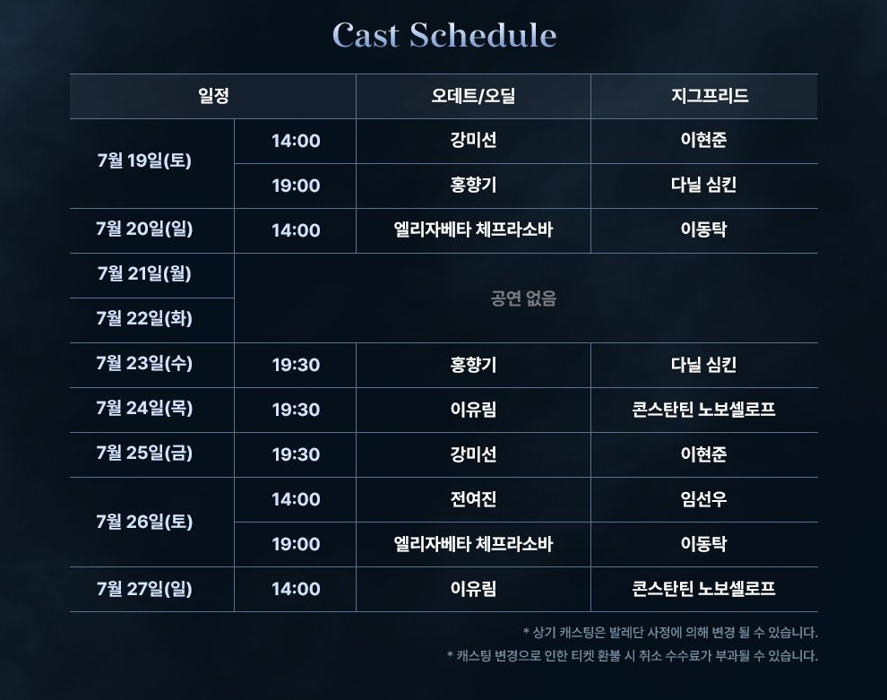 ※ 캐스팅 변경으로 인한 티켓 취소 및 환불은 예매처 고객센터를 통해 6.23(월) 오후 6시까지 수수료 없이 가능합니다