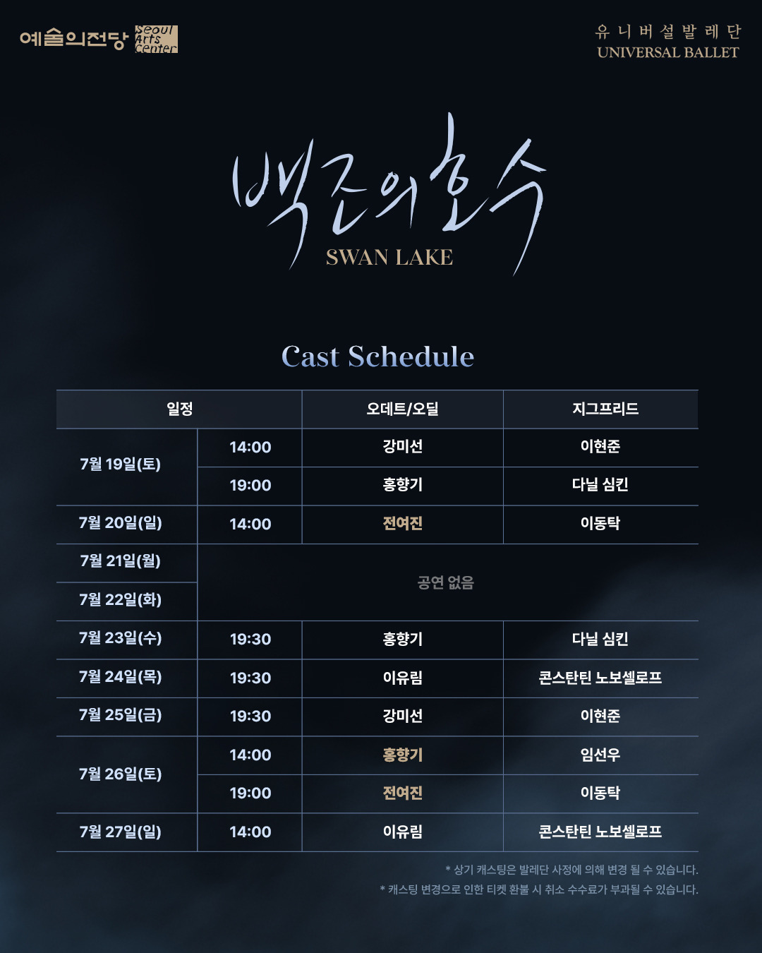 [2025 예술의전당&유니버설발레단 〈백조의 호수〉 주역 무용수 변경 안내]