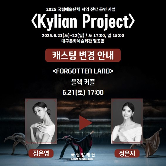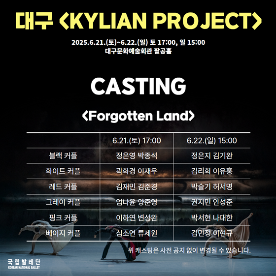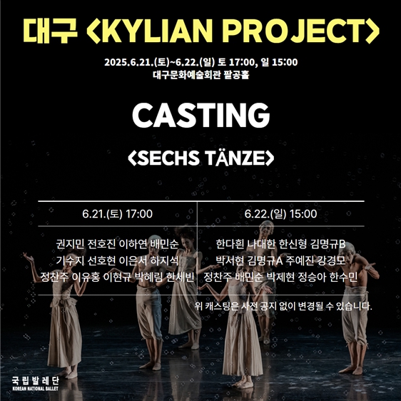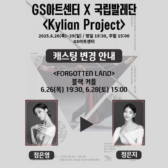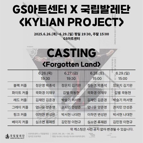 GS아트센터 X 국립발레단 < KYLIAN PROJECT > 캐스팅 안내 2025-05-28 ✨GS아트센터 X 국립발레단 〈KYLIAN PROJECT〉 캐스팅 공개!✨ GS아트센터 X 국립발레단 〈KYLIAN PROJECT〉의 캐스팅을 안내드립니다. 세계