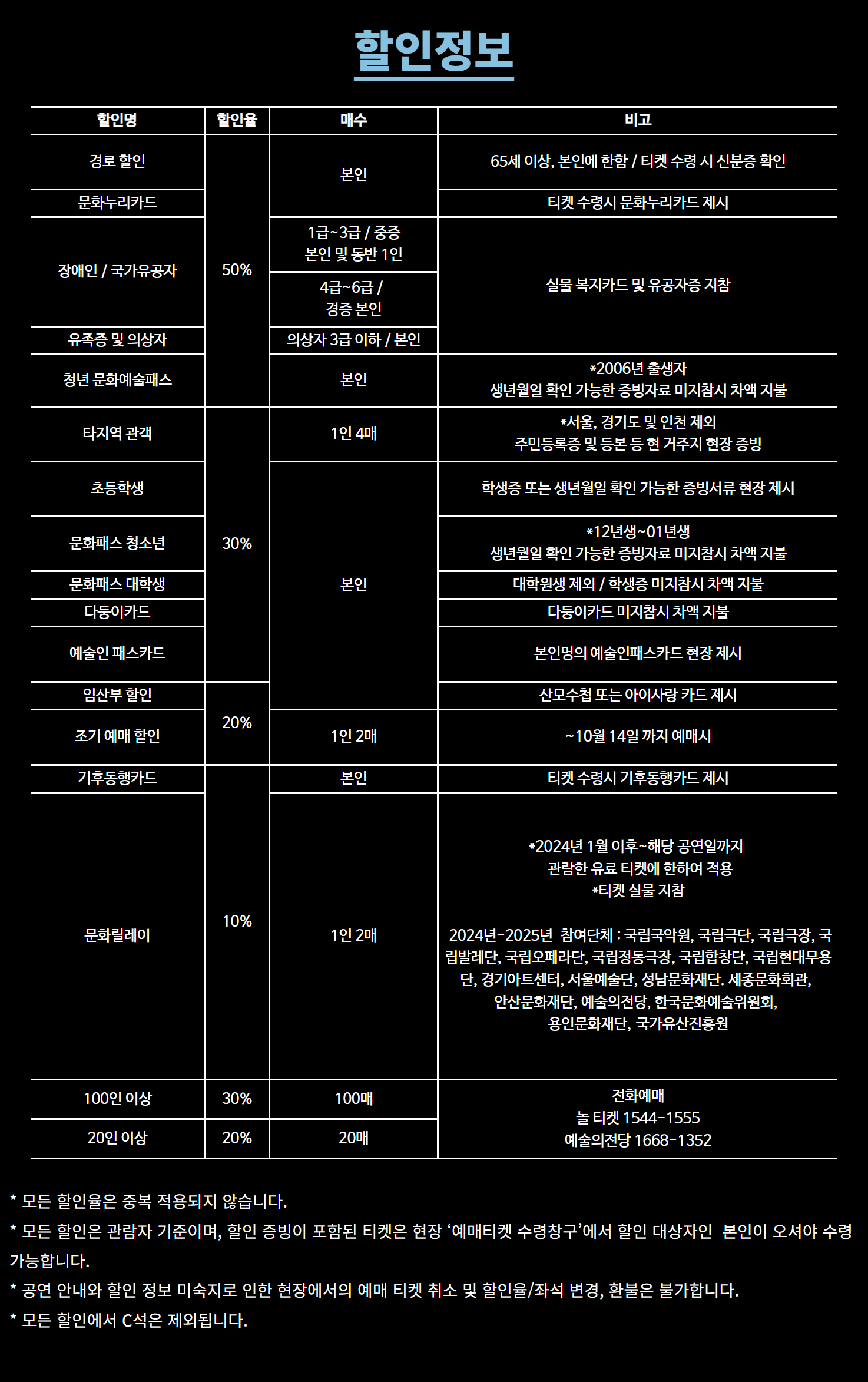 - 문화릴레이 할인 10% 2매 (R석, S석, A석, B석에 한함 / 1인 2매 / 2024년-2025년 공연 유료티켓 소지자 / 참여단체 : 국립국악원, 국립극단, 국립극장, 국립발레단, 국립오페라단, 국립정동극장, 국립합창단, 국립현대무용단, 경기아트센터, 서울예술단, 성남문화재단. 세종문화회관, 안산문화재단, 예술의전당, 한국문화예술위원회, 용인문화재단, 국가유산진흥원)