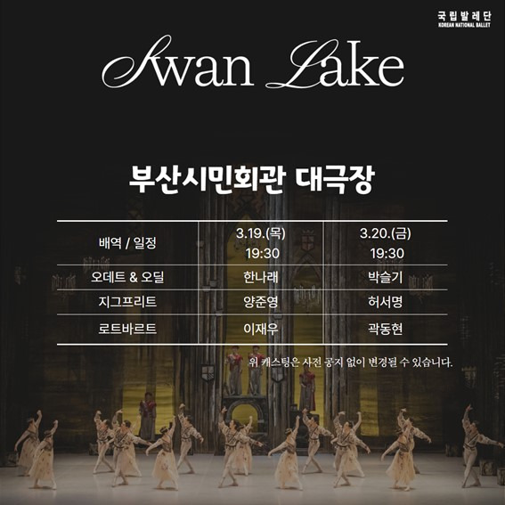 부산 <백조의 호수> 전체 캐스팅 변경 안내(03.18) 2026-03-12 왈츠 군무: 한세빈 ->강채연 귀족: 한승희 -> 심은지 러시아 군무: 한세빈 -> 한승희 6마리 흑조: 한세빈 -> 여정연 부산 <백조의 호수> 전체