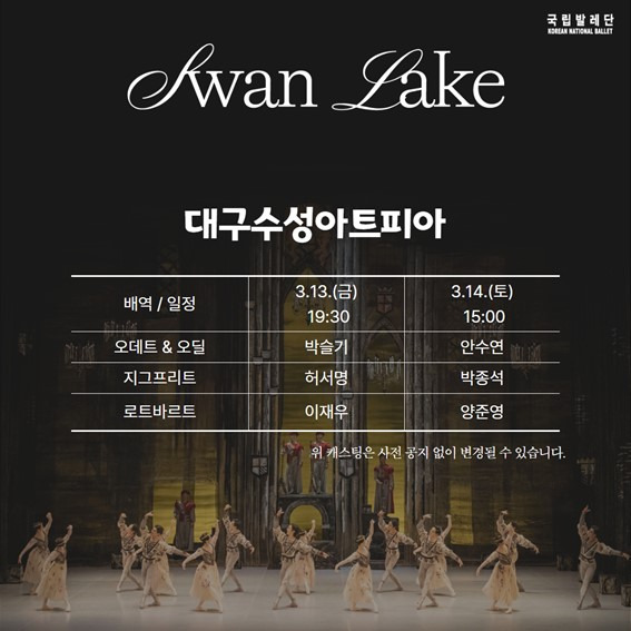 대구 <백조의 호수> 전체 캐스팅 변경 안내 (03.14) 2026-03-06 대구 <백조의 호수> 전체 캐스팅 변경 안내 캐스팅 / 일시 3.13.(금) 19:30 3.14(토) 15:00 오데트&오딜 박슬기 안수연 지그프리트 허서명
