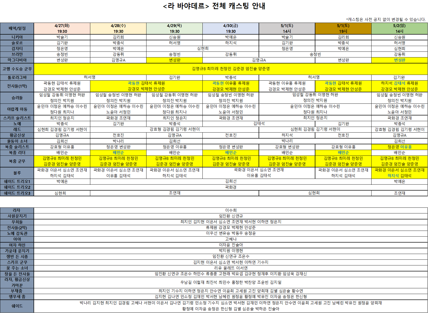 5/2(일) 캐스팅 변경