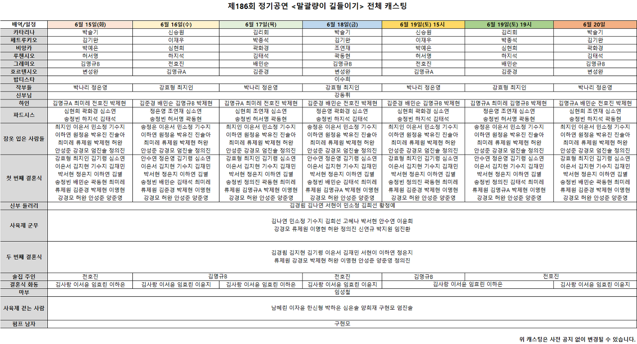 제186회 정기공연 <말괄량이 길들이기> 주역 및 일부 캐스팅 변경 안내 (*6/15(화) 19:30 공연)
