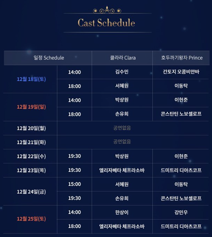 | 호두까기 왕자 | 이동탁 | 콘스탄틴 노보셀로프 | 강민우 | 드미트리 디아츠코프 | 콘스탄틴 노보셀로프 | 이현준 |