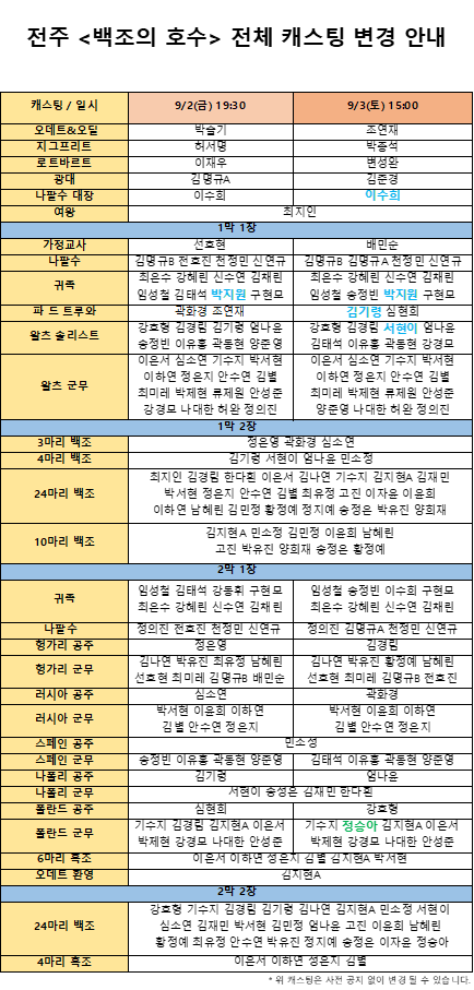 국립발레단 전주 <백조의 호수> 전체 캐스팅 변경 안내 2022-09-01 국립발레단 전주 <백조의 호수>의 캐스팅 변경에 대해 다음과 같이 안내드립니다. [폴란드 군무] 9/3(토) 15:00 양희재 ▶ 정승아