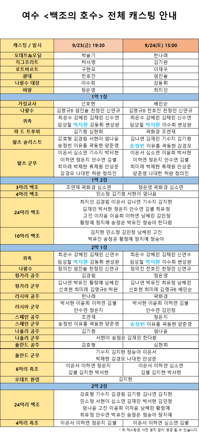 국립발레단 여수 <백조의 호수> 캐스팅 변경 안내 2022-09-22 국립발레단 여수 <백조의 호수> 캐스팅 변경 관련하여 아래와 같이 안내드립니다. 관람에 참고 부탁드리며, 캐스팅 변경에 대한 너른