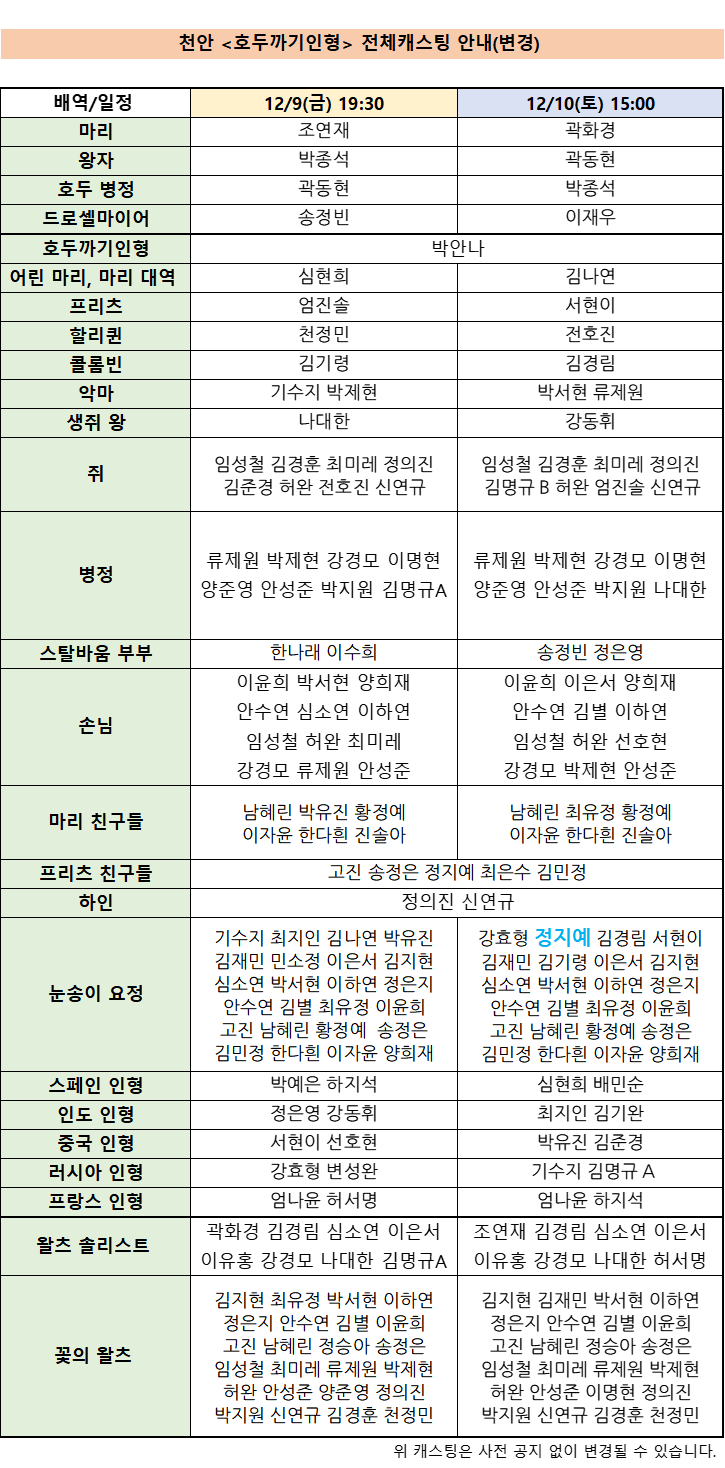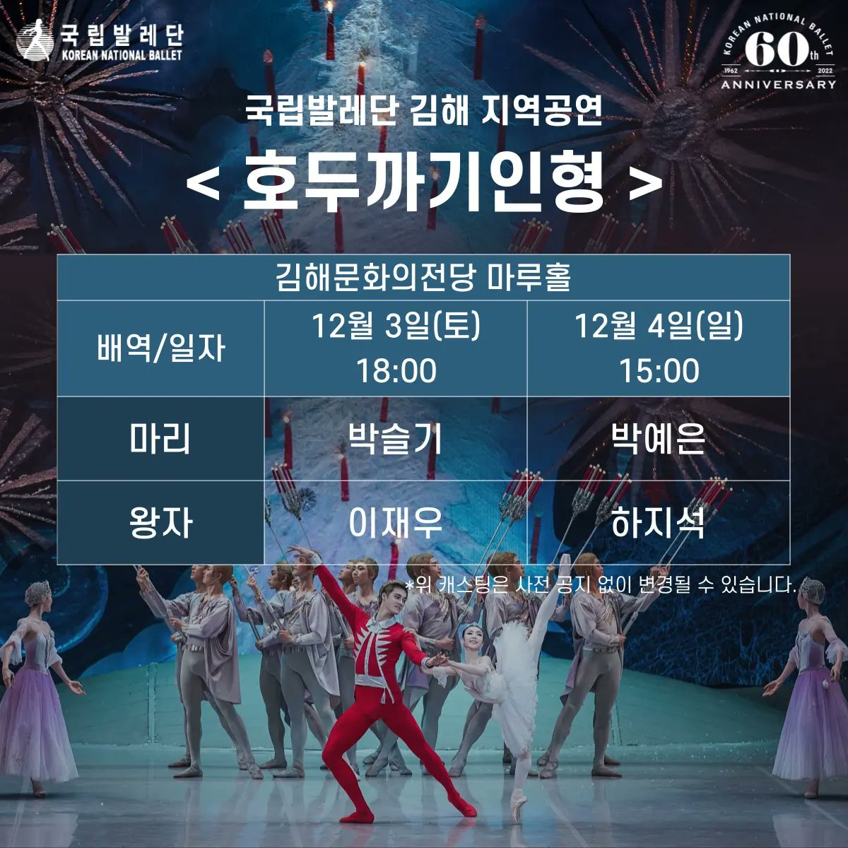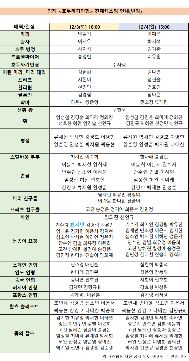 “- 국립발레단 김해/세종/천안 <호두까기인형> 캐스팅 안내 안녕하세요. 국립발레단입니다. 12월 공연 예정인 김해/세종/천안 <호두까기인형>의 캐스팅을 다음과 같이 안내드립니다. 올 겨울도