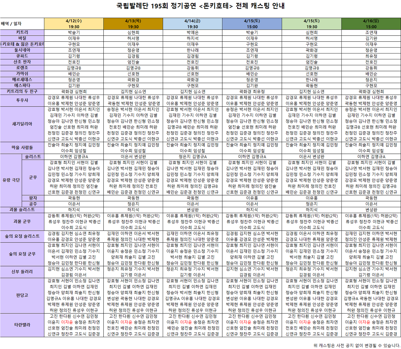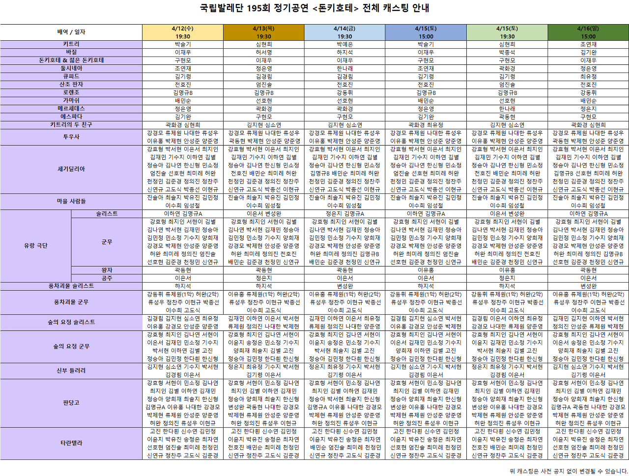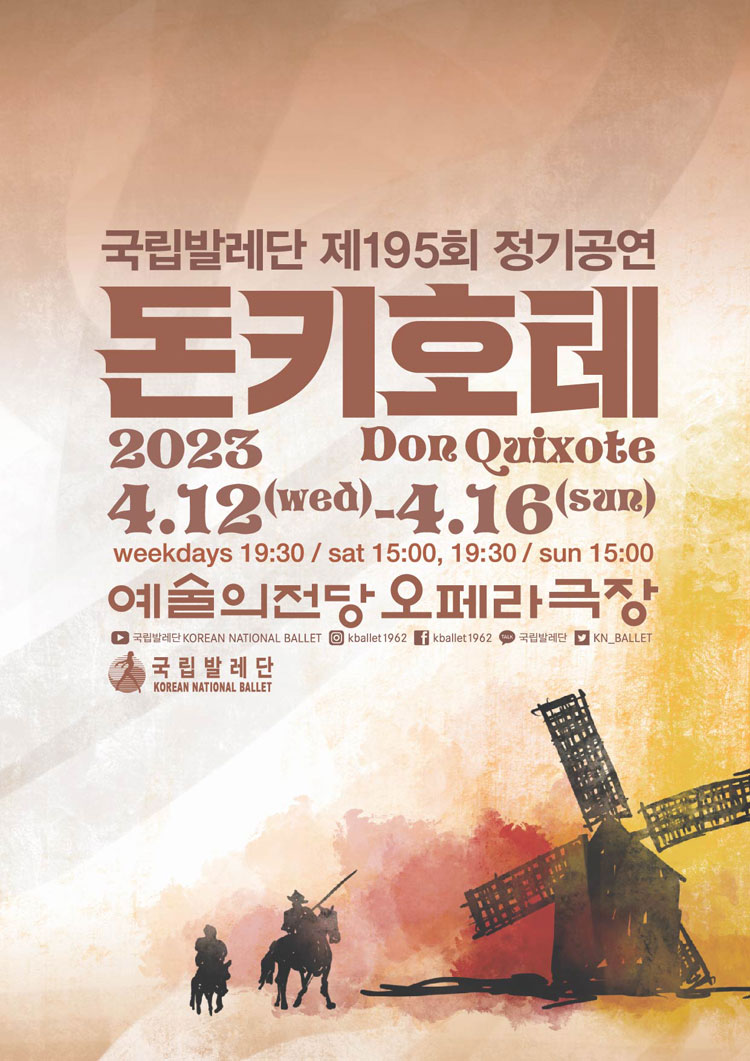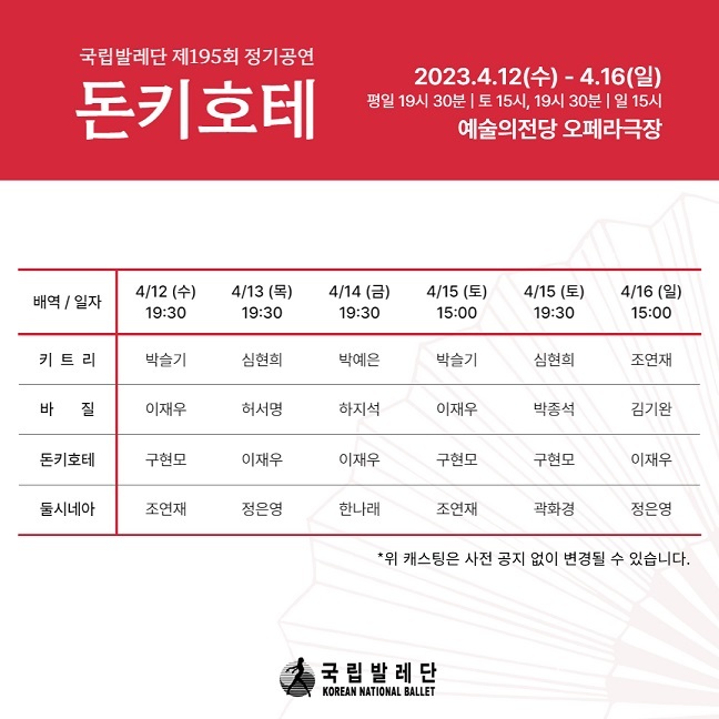 국립발레단 제 195회 정기공연 〈돈키호테〉 공연의 캐스팅 변경 안내 2023-04-07 국립발레단 제 195회 정기공연 〈돈키호테〉 공연의 캐스팅 변경을 안내드립니다. 4/15(토) 19:30 공연의 '바질'역이