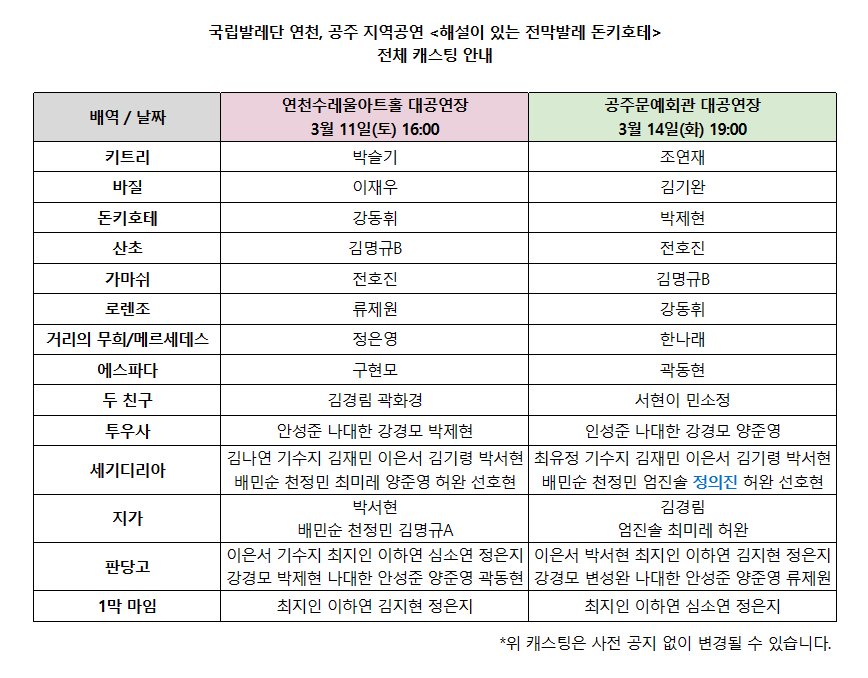 국립발레단 연천, 공주 지역공연 <해설이 있는 전막발레 돈키호테>의 캐스팅이 아래와 같이 변경되었습니다.