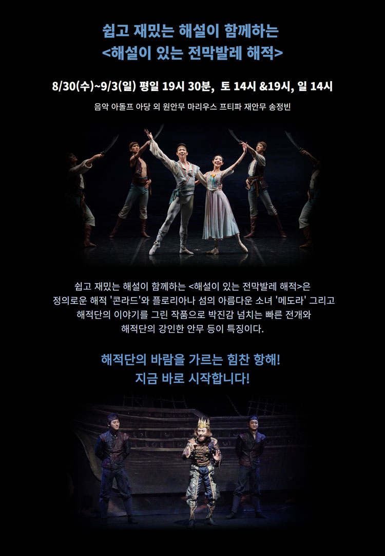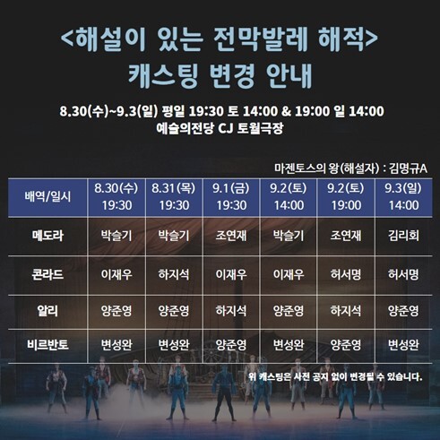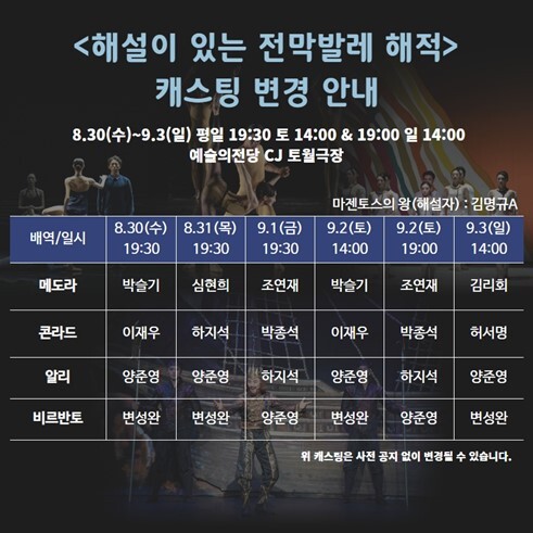 <해설이 있는 전막발레 해적> 캐스팅 변경 안내 2023-08-29 <해설이 있는 전막발레 해적>의 캐스팅이 아래와 같이 변경되었습니다. 8.31(목) 19:30 '메도라' 심현희->박슬기 9.1(금) 19:30 '콘라드' 박종석