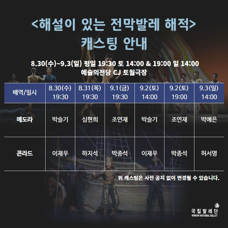 국립발레단 <해설이 있는 전막발레 해적> 전체 캐스팅이 아래와 같이 변경되었습니다.