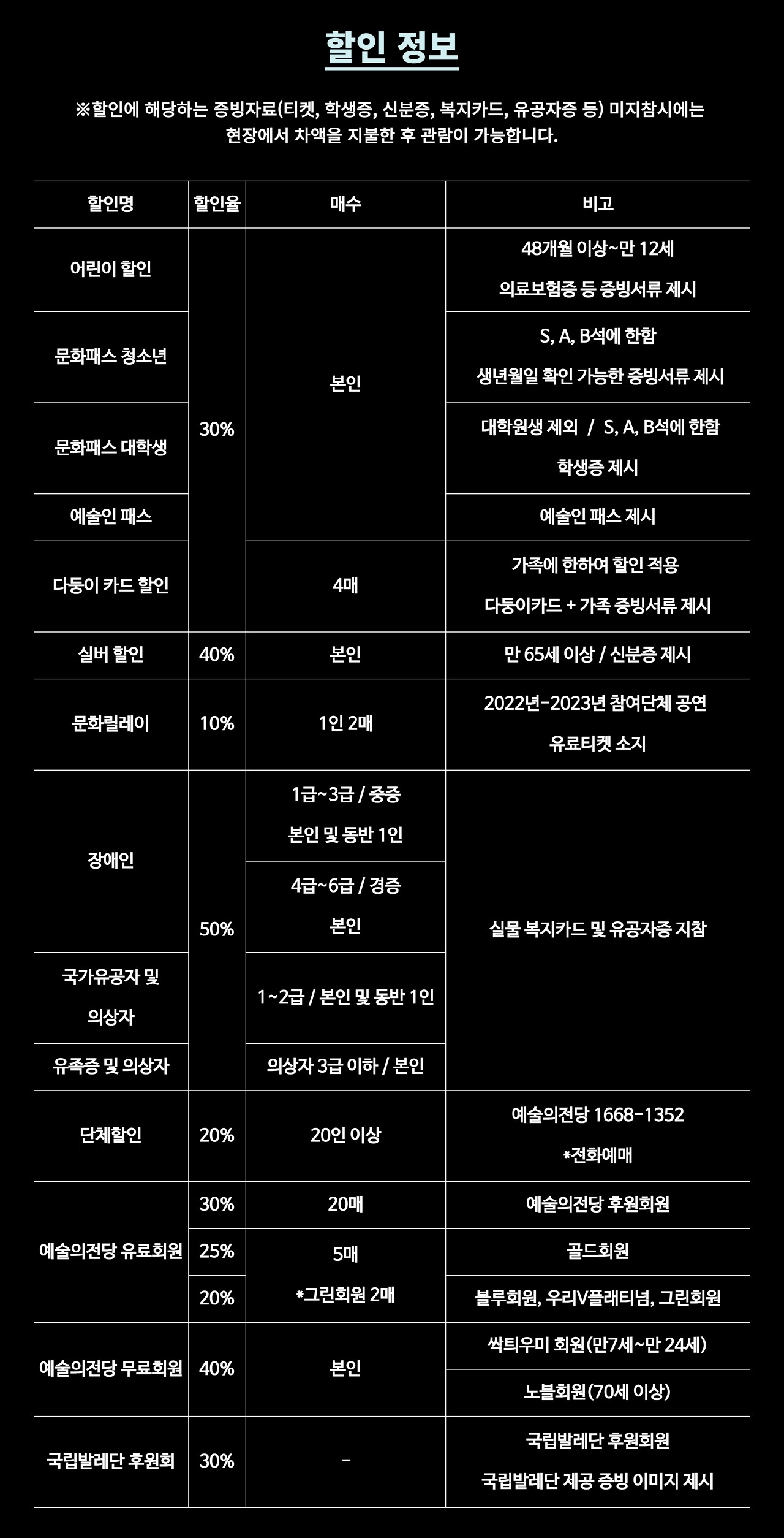 - 예술인패스카드 소지자 30% 1매 (R석, S석, A석, B석, C석에 한함 / 본인명의 예술인패스카드 현장 제시)