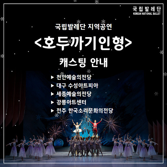 🎄공연일시 : 2024.12.14(토)~25(수)🎄평일 19:30 / 주말 14:00 &18:30 *12.25(수) 14:00,월요일 공연 없음🎄공연장소 : 예술의전당 오페라극장🎄티켓가격 : R석 100,000원┃S석 80,000원┃A석 60,000원┃B석 40,000원 ┃C석 20,000원 ┃D석 5,000원 2024 예술의전당 & 국립발레단 캐스팅 변경 안내2024 예술의전당 & 국립발레단 캐스팅이 무용수의 부상으로 부득이하게 아래와 같이 변경되었습니다. ———*12.21(토) 14:00‘왕자’김기완 ▶ 허서명 *12.24(화) 19:30‘왕자’김기완 ▶ 양준영——-해당 회차를 예매해주신 관객 분들의 너른 양해 부탁드리며, 캐스팅 변경으로 인한 환불은 전액 수수료 없이 진행됨을 알려드립..