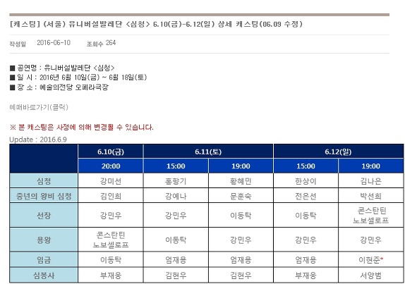 2016년 유니버설발레단 심청 캐스팅 (2016.6.10.수정)
