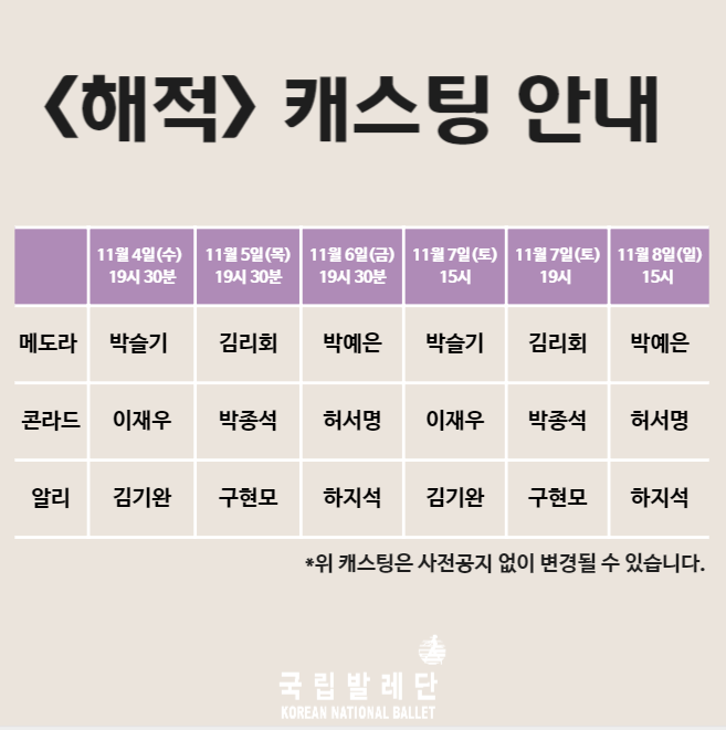 국립발레단 제183회 정기공연 <해적> 전체 캐스팅 안내